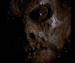 Saxton's reanimated creature, the possessed ape-man, is a fearsome monster, an atavistic creature that prods at the collective unconscious. Fernando Florida is credited with the makeup, including the eerie effect of the white eyeballs of the creature's victims, which look like cooked egg white and the glowing red eyes of the alien entity in its succession of hosts.